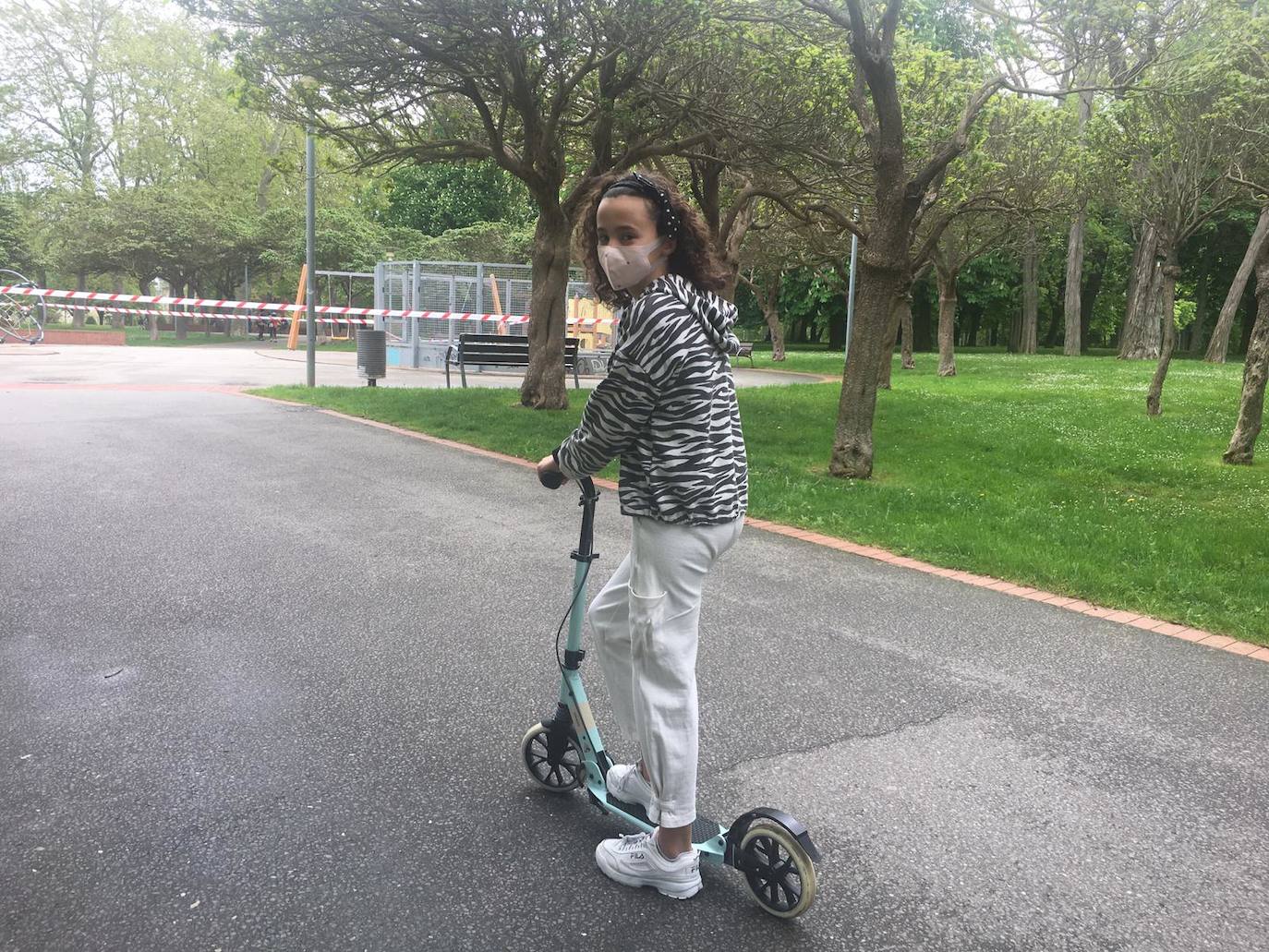 A Maite se le hacía raro salir con el patinete con la mascarilla puesta, pero se moría de ganas de salir y, junto con su madre Ana Concha, ha sido de las más madrugadoras pese a la fina lluvia que mojaba Zabalgana. «Ayer les explicamos que se iban a encontrar algo totalmente a lo que dejaron cuando salieran a la calle. Nos han visto a su padre y a mí con mascarillas, así que no les extraña demasiado», explica Concha. Han optado por no sacar balones por el momento y han tomado precauciones de cara al patinete. «Lo desinfectaremos bien y lo dejaremos en el trastero», avanzaban.