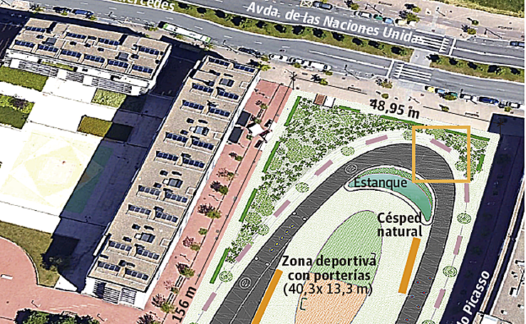 La zona deportiva irá adornada con un pequeño estanque en uno de los extremos y diversa vegetación, como tres variedades de setos, dos zonas emboscadas que marcan el límite del parque y un paseo central con arbolado. El resto de la superficie, que en total alcanza los 6.811 metros cuadrados de zona de actuación, estará rematada con diferente pavimentación, como hormigón y asfalto pulidos y césped artificial en la zona de porterías.