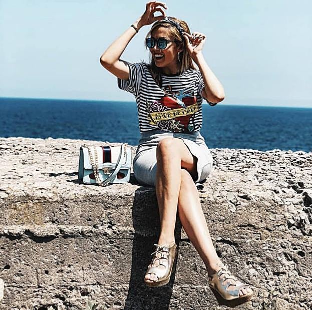 La diadema es de Stradivarius, la falda con volantes es de Que Bárbara, las botas de Héctor Riccione y la camisa es de Stradivarius, pero de otra temporada. Por otro lado, el look más serio se compone de pantalón de Stradivarius, camiseta de Gucci, zapatos de Daniela Vega y bolso de Lolita Blue.