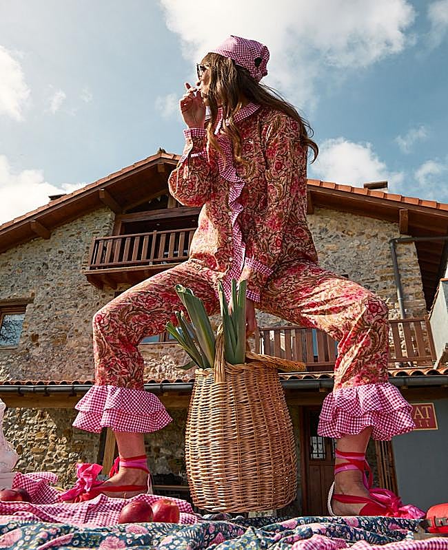 Un ejemplo es el pijama de rayas y flores, con cuello babero y lazada, que presenta un estampado floral que recuerda a un mantel antiguo (en el mejor de los sentidos). Los vivos de encaje blanco recorren toda la prenda, mientras que el pantalón, con rayas verticales y bolsillos decorados con puntilla, cuenta con cintura elástica y cuerda ajustable. El conjunto logra un equilibrio perfecto entre lo romántico y lo campestre. «Lo mejor es que se pueden separar las piezas: llevar la camisa como una blusa delicada con vaqueros, y el pantalón con una camiseta sencilla», explican desde Iturri Enea.