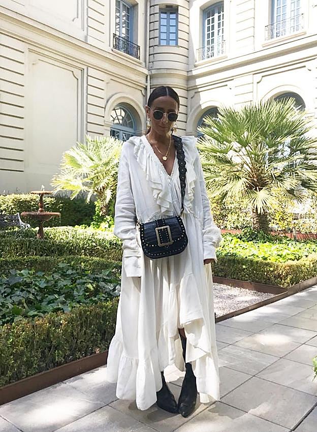 Los vestidos blancos se asocian inevitablemente al verano, sin embargo, hay quienes consiguen adaptarlo a otras épocas del año cambiando las sandalias por un calzado adecuado. Laura Eguizabal consigue una compensada mezcla 'black & white' gracias a un romántico vestido de volantes de H&M y unos botines de estilo cow-boy de caña alta que tan de moda han estado en lo que llevamos de año.