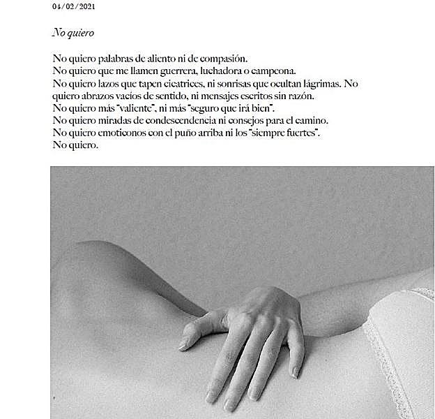 «No quiero palabras de aliento ni de compasión. No quiero que me llamen guerrera, luchadora o campeona. No quiero lazos que tapen cicatrices ni sonrisas que ocultan lágrimas. No quiero abrazos vacíos de sentido ni mensajes escritos sin razón. No quiero más 'valiente' ni más 'seguro que irá bien'. No quiero miradas de condescendencia ni mensajes para el camino. No quiero emoticonos con el puño arriba ni los 'siempre fuertes'. No quiero».
