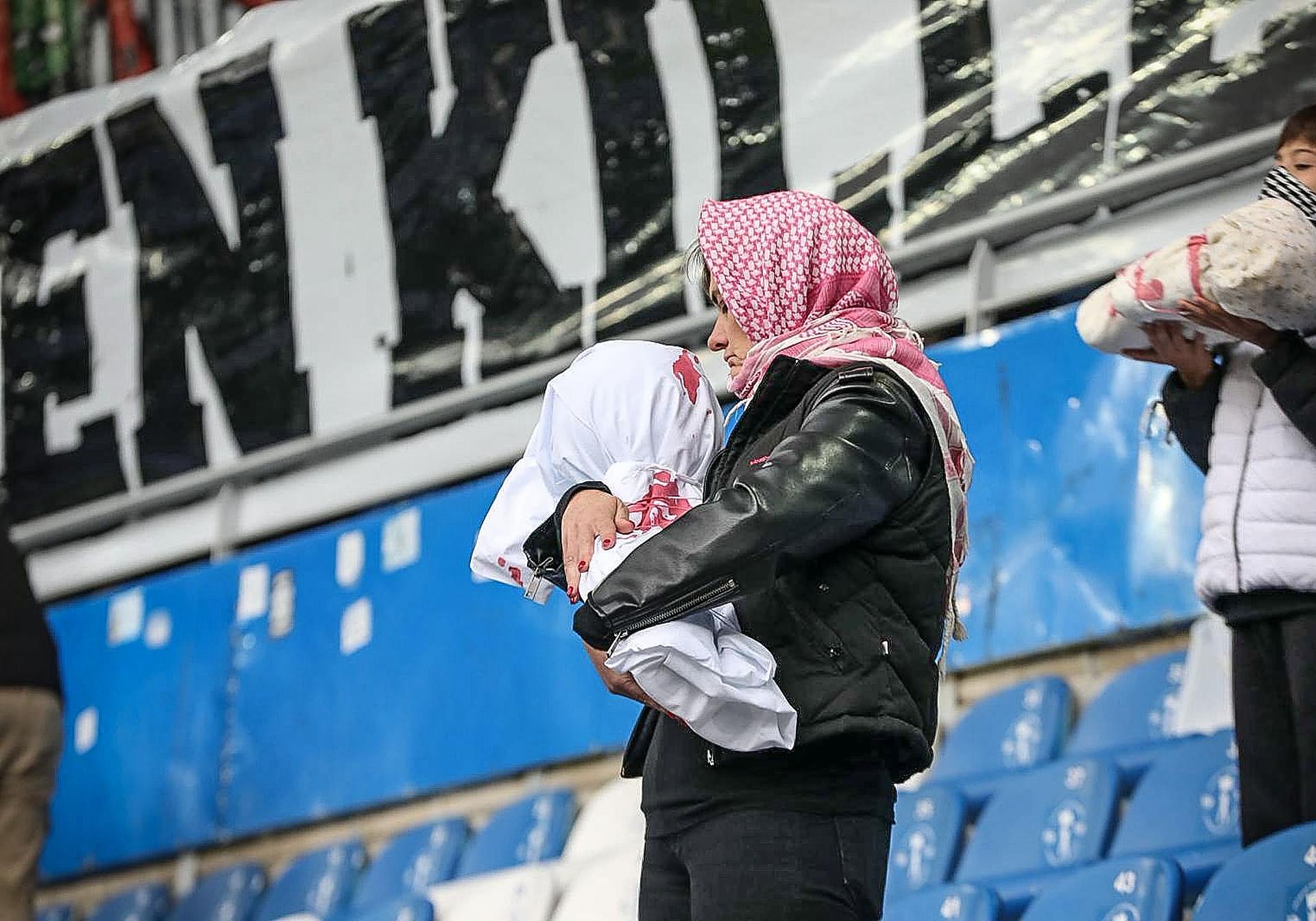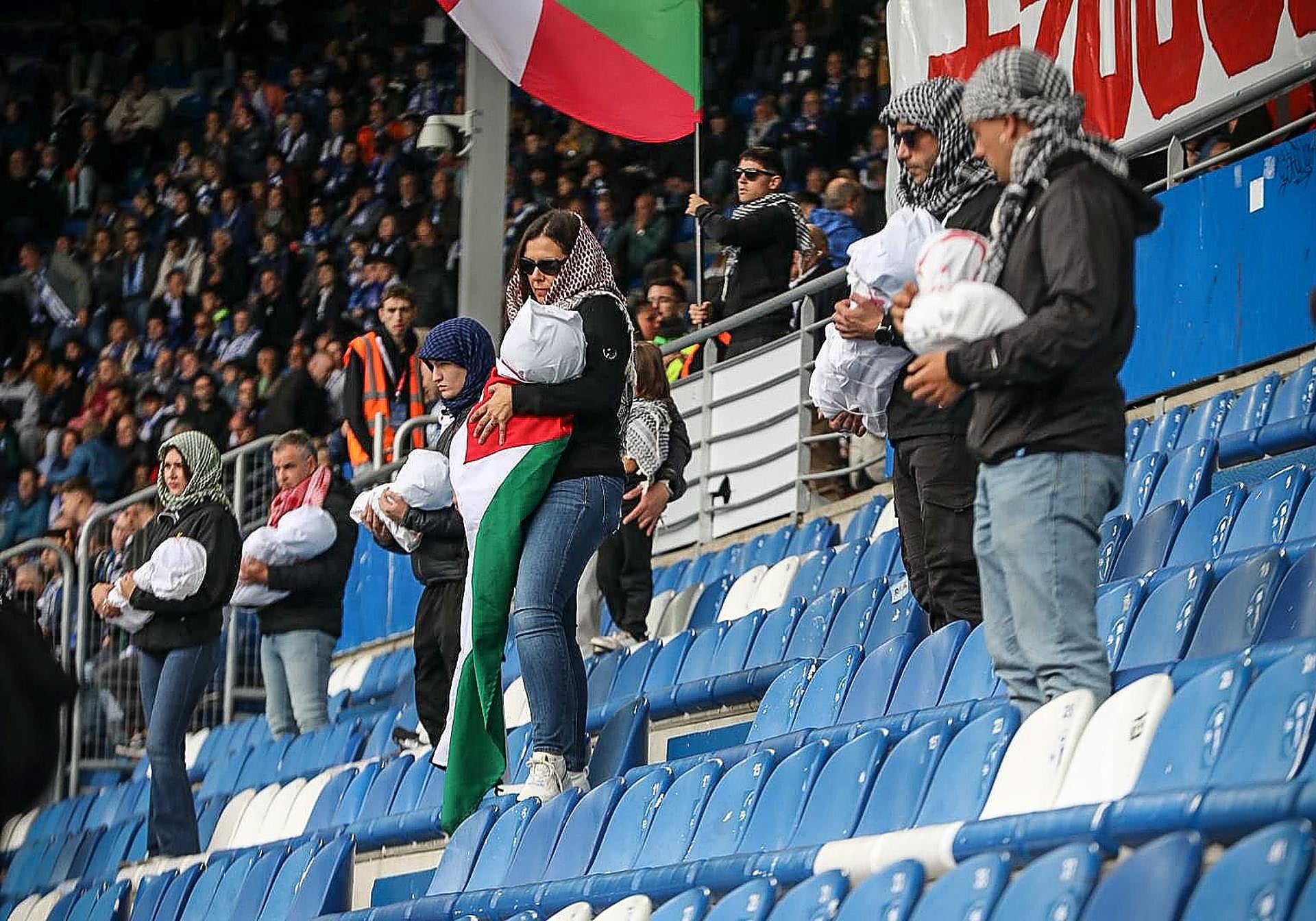 El fondo que ocupa la grada de animación ha permanecido vacío durante los primeros cinco minutos del duelo. En la grada se ha desplegado una pancarta enorme en la que el 'Gernika', con los colores de la bandera palestina, ha servido de marco para trasladar el mensaje. Asimismo, debajo había una pancarta con el mensaje «Más de 20.000 niños asesinados. Stop Genocidio. Palestina libre». Y algunos aficionados han evocado con muñecos y otros elementos cubiertos con sangre roja a los niños asesinados en Gaza.