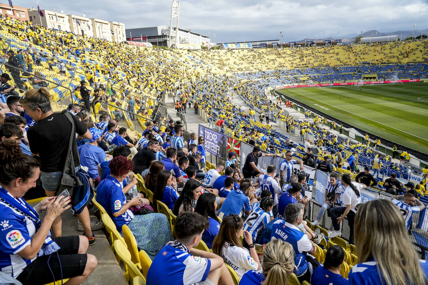 La afición de Las Palmas se agolpa en los aledaños del estadio de Gran Canaria para recibir al equipo. La del Alavés, se mantiene en el Parque de Santa Catalina, a veinte minutos por carretera del campo.