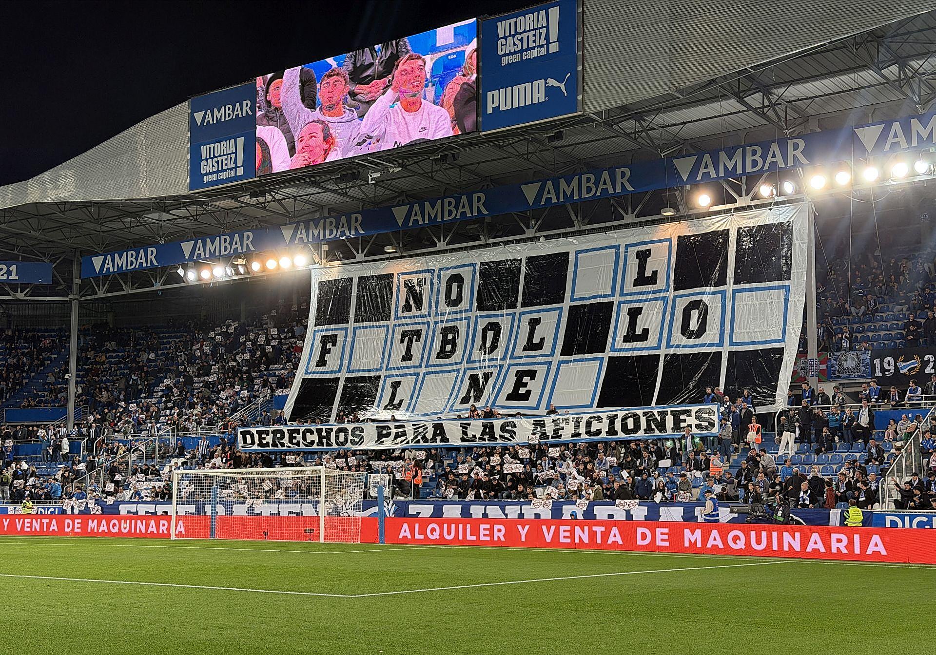 El partido en Miami no ha sido el único foco de las críticas. La afición del Alavés ha vuelto a mostrar su rechazo a la decisión de LaLiga de fijar el partido de los albiazules entre semana, en esta ocasión en un lunes. En el fondo de Polideportivo, Iraultza ha desplegado un enorme tifo en el que ha emulado el juego de 'La ruleta de la suerte' dejando varias letras ocultas para resolver en el mensaje «no al fútbol los lunes», además de otra en la que reivindica «derechos para las aficiones». Una situación que el curso pasado se repitió en varias ocasiones y generó especial rechazo entre los aficionados.