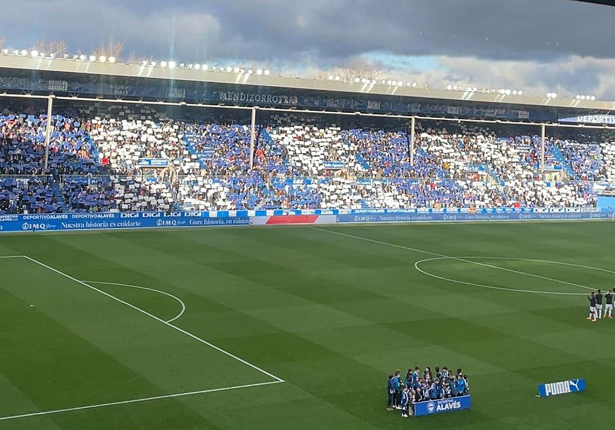 Mendizorroza se tiñó de albiazul antes del derbi entre el Deportivo Alavés y el Athletic. Las gradas del estadio realizaron un mosaico para dar la bienvenida a los futbolistas en un encuentro clave para los de Coudet, que se estrenaba como local con el conjunto vitoriano.