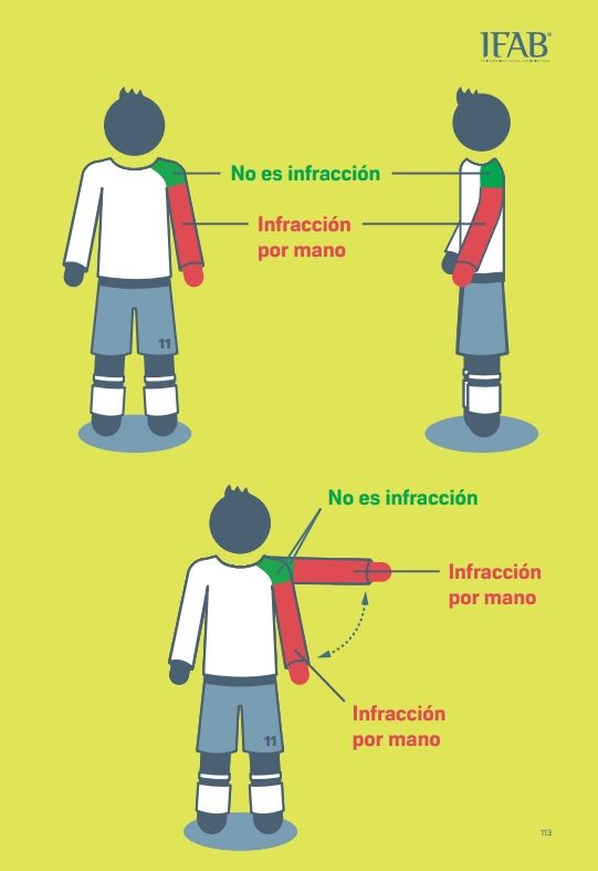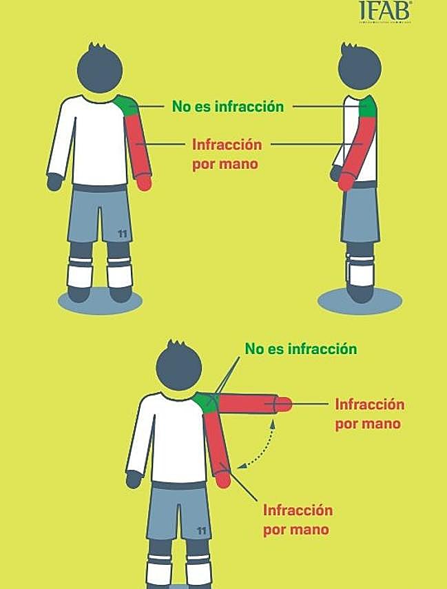 ¿Qué dicen las reglas de juego? «Con el fin de determinar con claridad las infracciones por mano, el límite superior del brazo coincide con el punto inferior de la axila, tal y como ilustra el gráfico» que prece a este párrafo. Es decir, si el balón golpea en ese punto «no es infracción». La cuestión es si el esférico le impacta por encima o por debajo de esa fina frontera. A juicio del árbtiro, lo hace en la zona de castigo.
