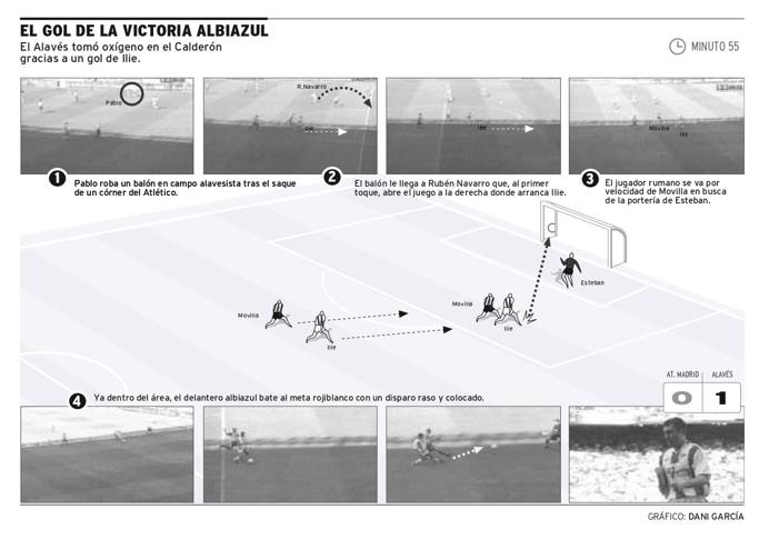 «Tenemos algunos flashes de la jugada. Ilie finalizó con un disparo cruzado», recuerdan, a duras penas, los tres protagonistas. La cronología del gol arranca en el campo alavesista. Pablo Gómez robó un balón tras el saque de un córner del Atlético. El balón le llegó a Rubén Navarro, que, al primer toque, abrió el juego a la derecha, donde se encontraba Ilie, que llevaba cuatro minutos sobre el césped. El rumano aprovechó esa frescura para irse por velocidad de Movilla, con la portería de Esteban entre ceja y ceja. Ya dentro del área, el ariete batió al meta rojiblanco con un disparo raso y colocado.