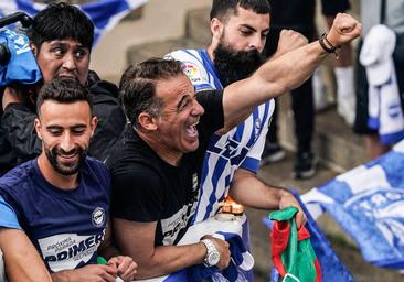 Durante el recorrido, Villalibre, enfundado en una ikurriña, se ha colocado en la parte delantera del autocar descapotado. No ha parado de saludar y de levantar el brazo izquierdo para seguro regocijo de los asistentes. En la Virgen Blanca ha entrado pegado al técnico, Luis García Plaza. Se le ha visto contenido... hasta que el convoy de Primera ha parado frente a la balconada. Ahí, como sus compañeros, ha estallado de felicidad.