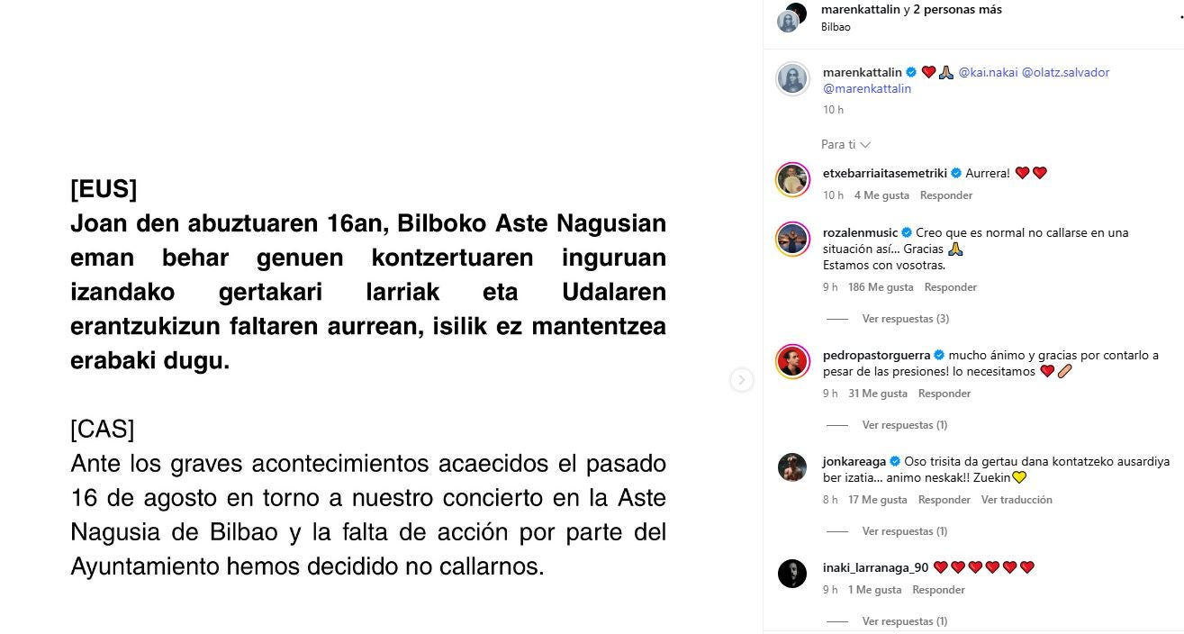 Una de las primeras artistas en reaccionar a esta polémica ha sido Rozalén. La albaceteña, que actúa esta noche en el Parque Europa dentro del cartel de Aste Nagusia, ha salido en defensa de sus compañeras de profesión. «Creo que es normal no callarse en una situación así… Gracias. Estamos con vosotras», ha escrito en la red social de Maren, junto al comunicado publicado por la artista. Una de las afectadas, Olatz Salvador, ya le ha agradecido públicamente su apoyo.