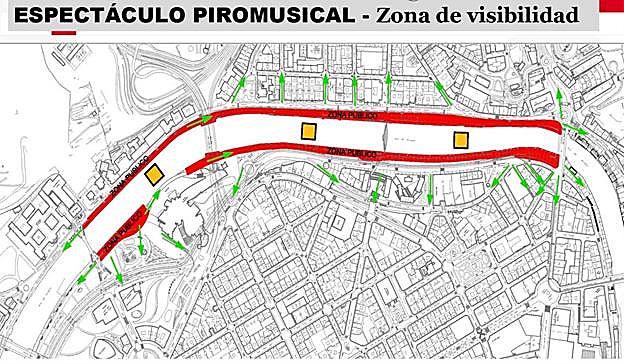 El plan es atractivo, pero también preocupa a las autoridades porque tiene sus peculiaridades. Para presenciarlo no vale acudir a los lugares que cada uno tiene por costumbre en las noches de fuegos, sino que sólo podrán ser disfrutados desde ambos márgenes de la ría, entre el puente del Ayuntamiento y la pasarela Pedro Arrupe. Eso va a suponer un movimiento enorme de personas que pueden llegar a confluir con los que acudan al concierto de David de María en Abandoibarra. Andoni Oleagordia, director de Protección Civil, asegura que hay espacio y tiempo para que la multitud se mueva. Pero la Policía Municipal estará muy atenta.