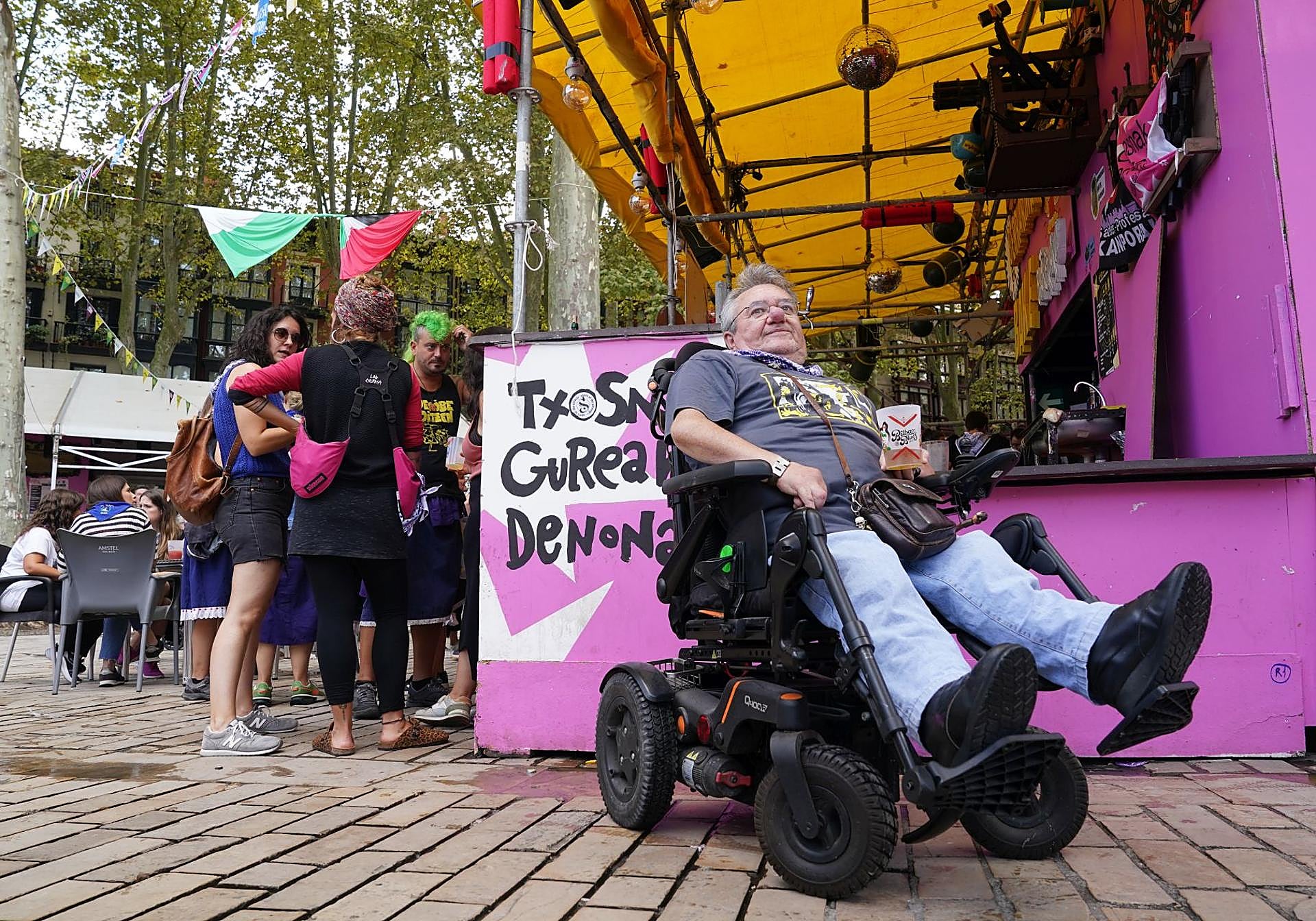 «Me encanta ir a las barracas, los conciertos, los espectáculos callejeros... me gusta andar en todas las salsas», asegura José Antonio, que a sus 56 años, se desplaza en una silla de ruedas motorizada. Viene en metro desde Sopela «por lo menos tres o cuatro días» a la Aste Nagusia.