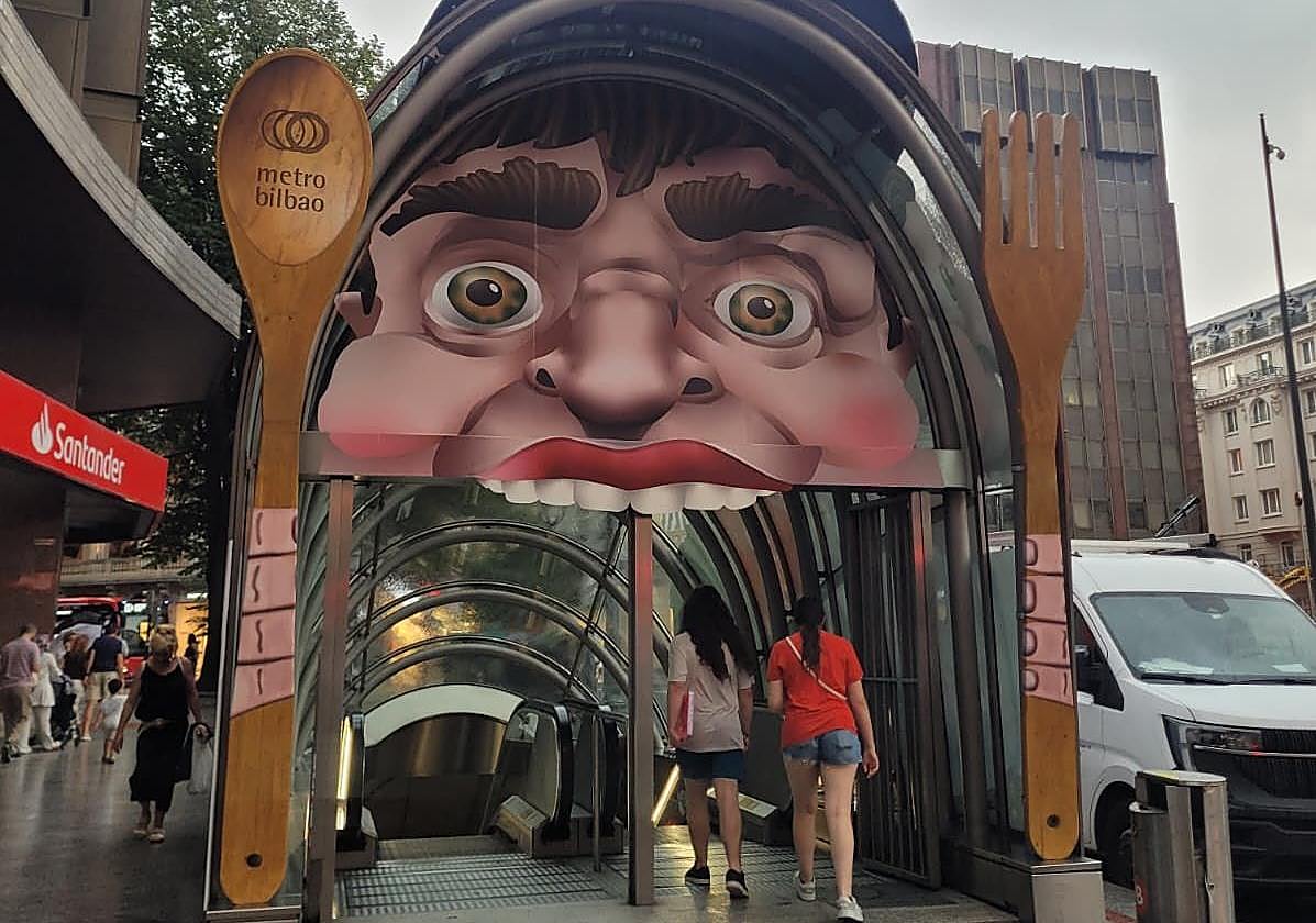 Bilbao ha comenzado a vestir sus calles para Aste Nagusia. Entre los distintos preparativos de cara al sábado, el día en el que tendrá lugar el txupinazo y el saludo de Marijaia desde el balcón del Arriaga, las bocas de metro de la plaza Moyua, tanto la de Elcano como la de Ercilla, lucen un nuevo aspecto. Como ya es habitual, uno de los personajes más queridos por los bilbaínos recibe a los viajeros que entran y salen de la céntrica parada. Se trata de Gargantua.