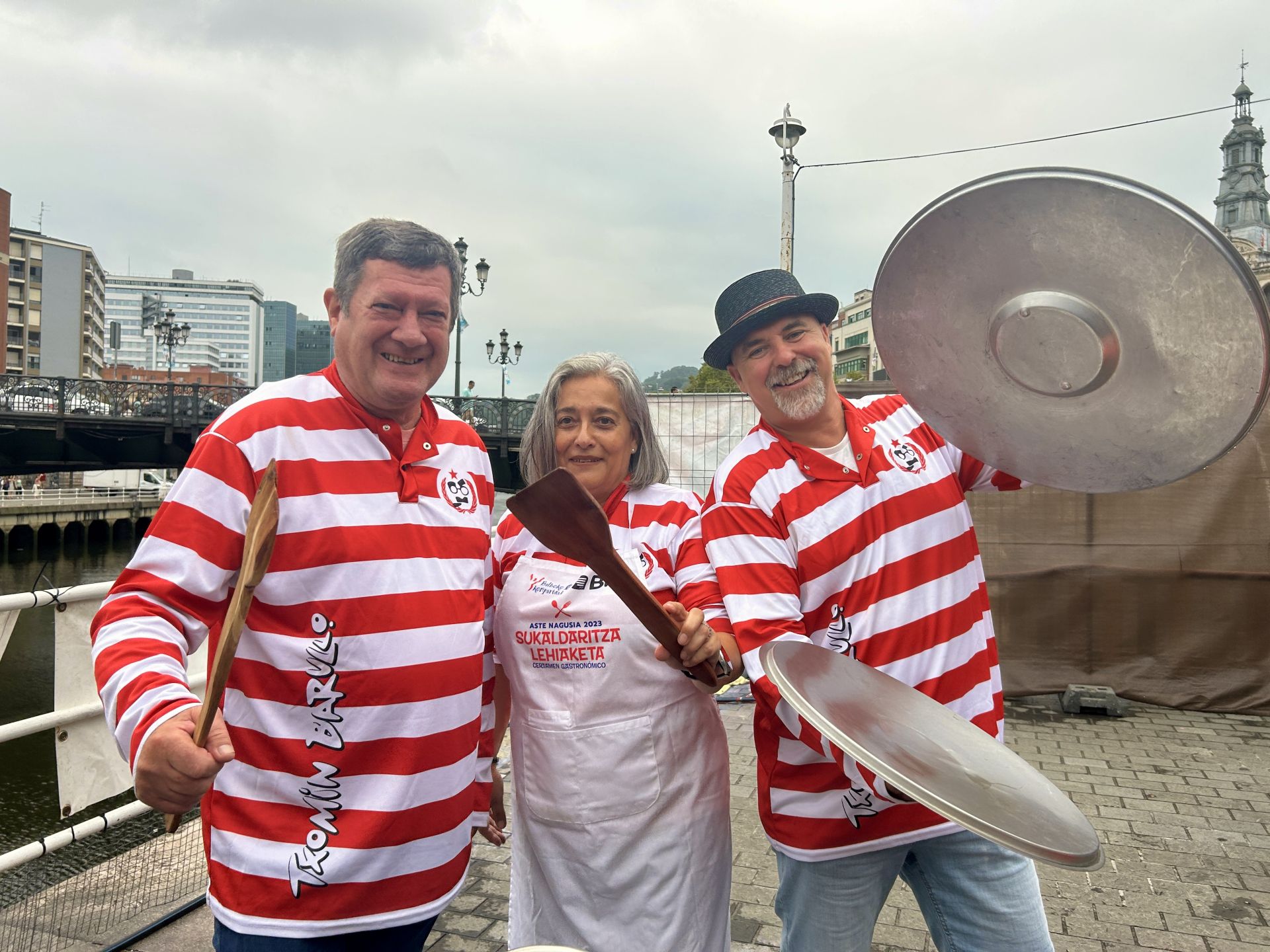 A lo largo de estos años ha demostrado sus dotes culinarias cocinando platos de lo más variados: bacalao al pil-pil, marmitako, guiso de rabo de toro… Empezó con su cuadrilla de siempre y poco a poco se han ido uniendo más personas que ha conocido en los ratos de poteo, o incluso en el barrio. «Estábamos Aitor, Jon, Javi, Yolanda, Sonia, que es mi mujer... Ahora somos más gente, pero faltan algunas personas. Nuestra amiga Yolanda falleció y la echamos mucho de menos», recuerda sin poder evitar emocionarse. Los concursos gastronómicos van mucho más allá de cocinar un plato tradicional. Se trata de una reunión sagrada para los amigos, un punto de encuentro para vivir las fiestas con la mejor compañía, recordar viejos tiempos, trabajar en equipo… Y esa tradición con arraigo ha traspasado generaciones.