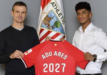 Adu Ares es un chico feliz. Con 22 años, ya está en la primera plantilla del Athletic, club con el que ha renovado este jueves hasta 2027 y al que agradece «que nos brinde a mi familia y a mí esta confianza, estamos muy orgullosos». El extremo bilbaíno, que ha atendido a los medios tras rubricar el acuerdo en San Mamés, quiere ahora «devolver esta confianza haciendo las cosas que sé hacer en el campo».