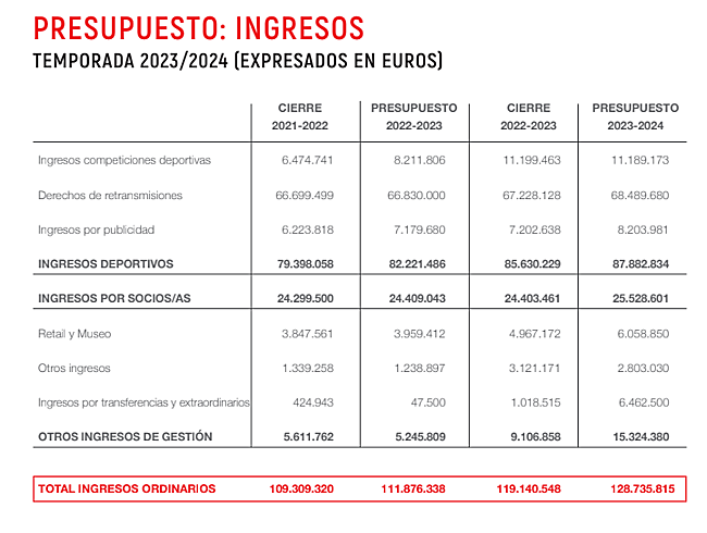 La junta directiva que preside Jon Uriarte va a plantear a los compromisarios una estimación de ingresos ordinarios relativamente conservadora, aunque con el aumento de otros 9 millones de euros en total. Más de la mitad, cinco millones, son de carácter extraordinario y su detalle no se conoce por el momento. Los ingresos por publicidad, los derechos de televisión y las cuotas de los socios aportarán tres millones más que en la última temporada. Crecimiento sí, pero más aparente que real. Si se descuenta la inflación estamos ante un estancamiento de estos capítulos.