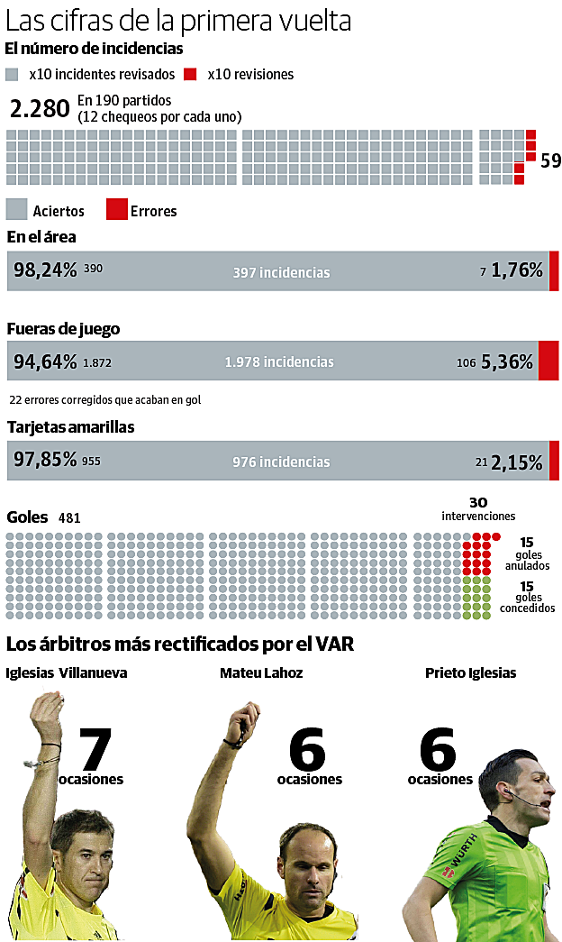 La relación del Athletic con el VAR arrancó en el derbi contra la Real en la primera vuelta. Ese día, Hernández Hernández señaló penalti de Iñigo Martínez sobre Sangalli cuando los rojiblancos ya buscaban la portería de la Real en San Mamés. El colegiado visionó la jugada en el monitor de televisión a pie de campo, repasó varias veces la acción, e interpretó que había sido pena máxima. Al siguiente partido, en Eibar, sucedió algo similar. El de Ondarroa cometió una falta en el área, señalada a instancias del videoarbitraje. Era finales de octubre, y Eduardo Berizzo clamó contra este 'asistente'. «Debería ser una herramienta de consulta, no que un árbitro arbitre por encima del colegiado. Hay circunstancias que no se aprecian bien por televisión. No digo que no sea penalti, sino que el árbitro consulte si quiere. No se deben invertir los papeles y que alguien desde fuera rearbitre el partido», protestó el 'Toto'. Y, más cerca en el tiempo, lo ocurrido con la diana de Aduriz en la Copa del Rey: en el duelo de ida contra el Sevilla en Bilbao, el colegiado anuló el tanto por un fuera de juego previo; la lesión del guipuzcoano en su intento por anotar no sirvió de nada.