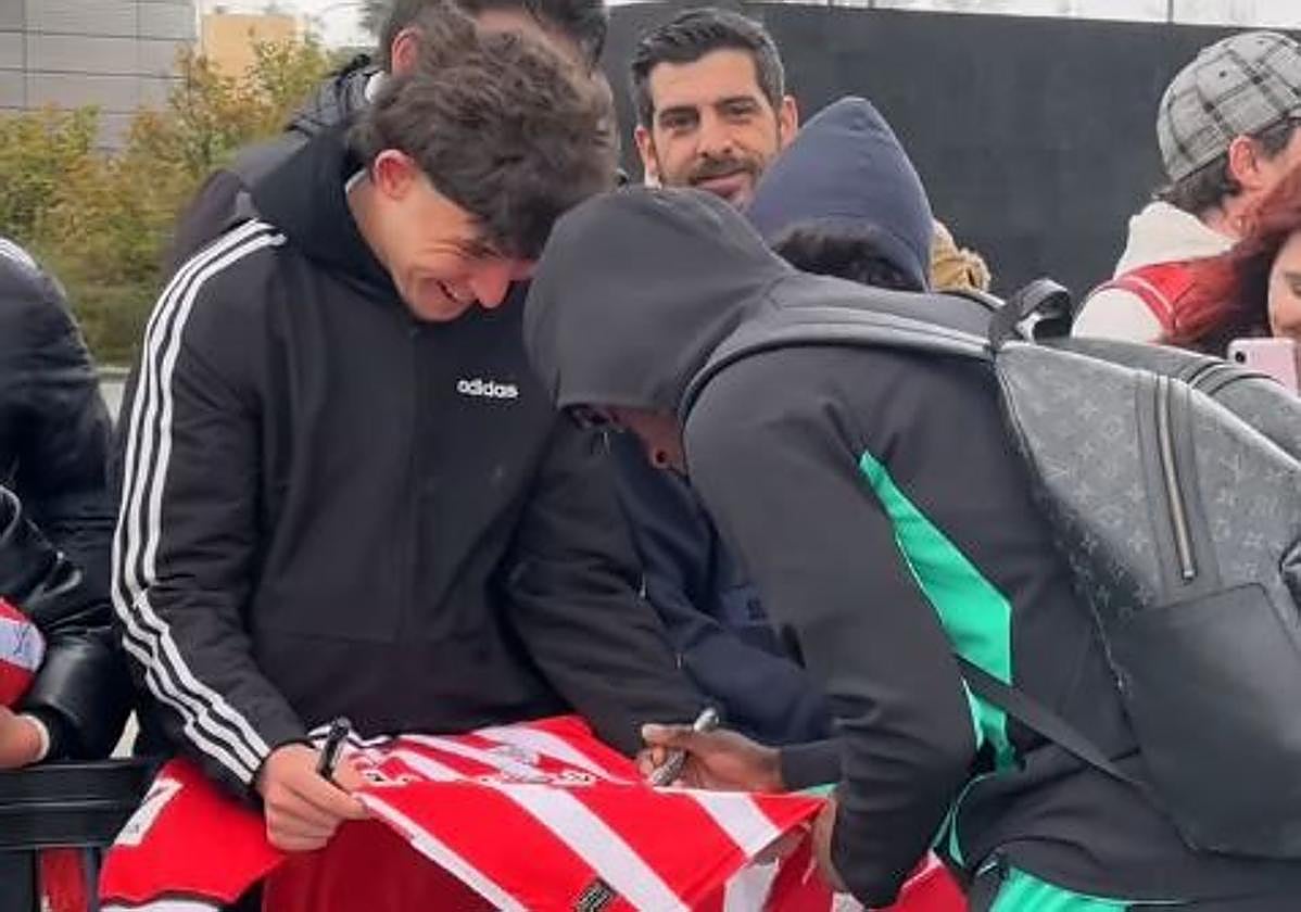 La lluvia y el viento que se han dejado notar este sábado a mediodía en Madrid no han sido impedimento para que un grupo de athleticzales se acercaran a recibir a su equipo a su llegada a la capital, donde esta noche se enfrentarán al Atlético. Nico Williams ha sido uno de los jugadores que se ha acercado a los aficionados para firmar camisetas y agradecer el apoyo.