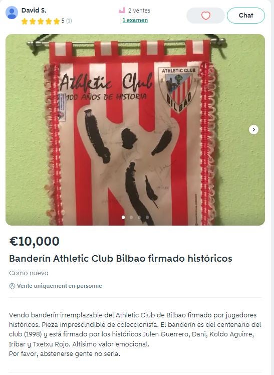 «Vendo banderín irremplazable del Athletic Club de Bilbao firmado por jugadores históricos. Pieza imprescindible de coleccionista». Así anuncia un usuario de 'Wallapop' un usuario la venta de un banderín en el año del centenario. Hasta ahí, todo normal. Hasta que uno se fija en el precio que pide por él. Nada más y nada menos que 10.000 euros. Un capricho al alcance de pocos bolsillos.