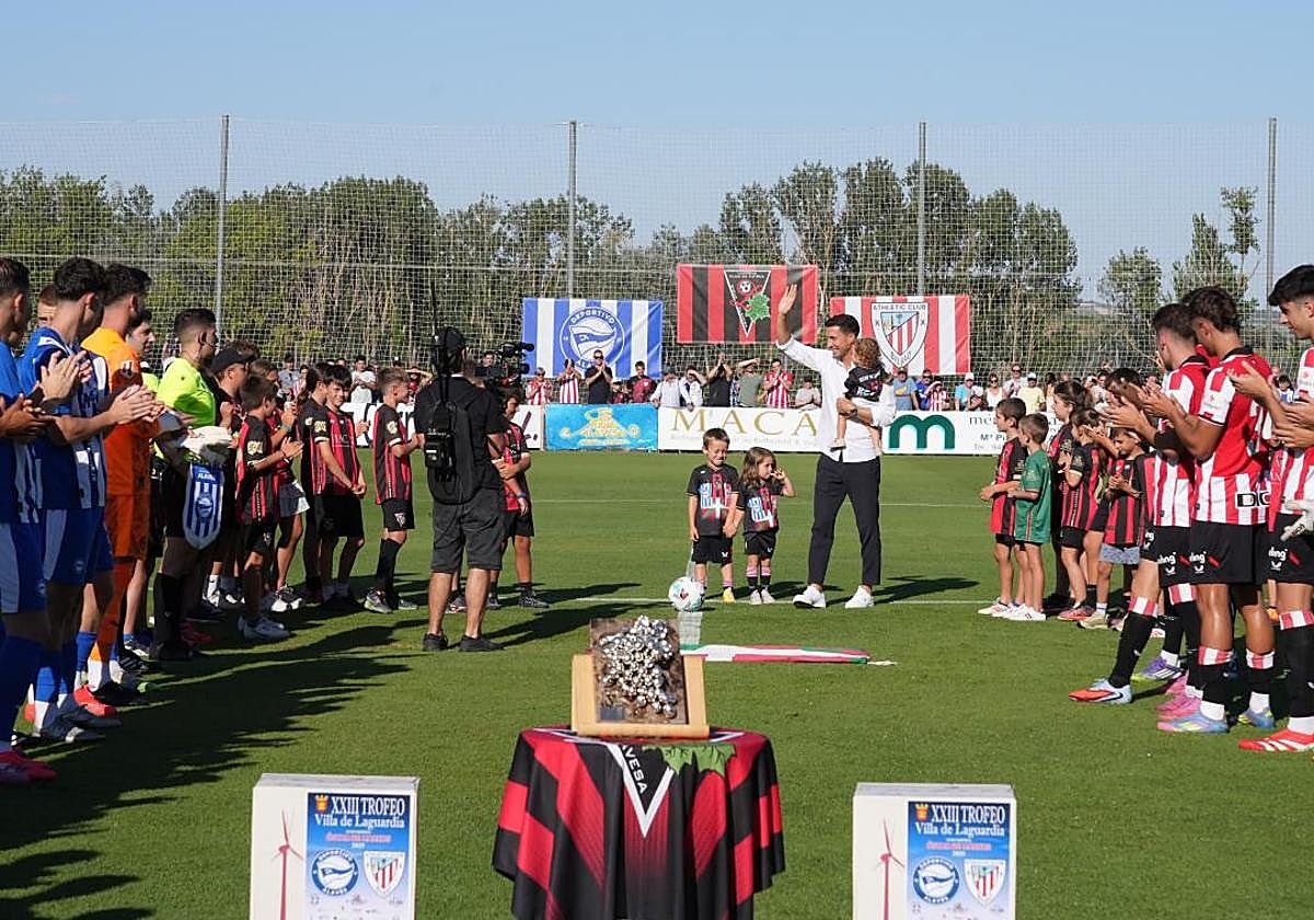 El marcador del campo daba la bienvenida a la nueva denominación del recinto de Laguardia. Desde ahora lleva el nombre de un exfutbolista que creció en el Alavés y se convirtió en un referente en el Athletic. Óscar de Marcos es el segundo jugador con más partidos disputados en la centenaria historia rojiblanca, solo por detrás del mito Iribar. Así que el Trofeo Villa de Laguardia fue la excusa perfecta para que Alavés y Athletic se acercaran hasta la localidad del '18' rojiblanco para rendirle homenaje tras su retirada.