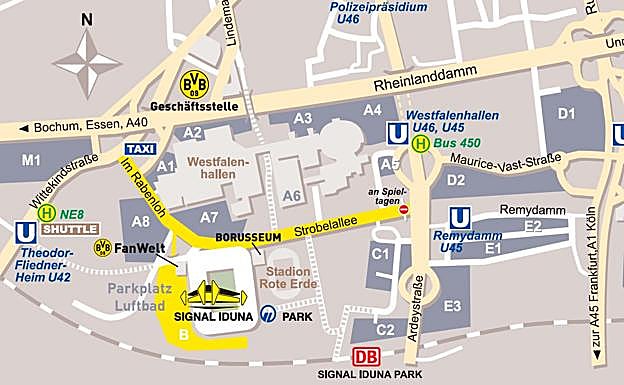 Transporte público en Dortmund: desde la estación central, trenes locales conectan con las estaciones de Westfalenhalle y Signal Iduna Park (a tres minutos a pie del campo). En metro (U-Bahn), se pueden usar las líneas U45 y U46 hasta la parada Westfalenhalle/Stadion. En autobús, la línea recomendada es la nº 450.