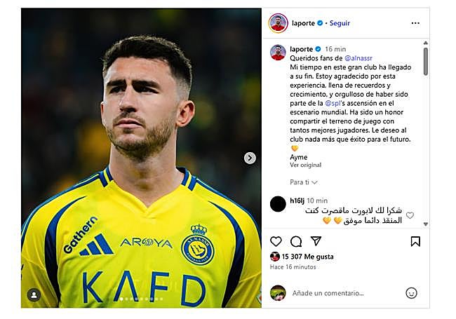 El Nassr por su parte también ha realizado una publicación en Instagram anuncuiando la despedida de Laporte, en un mensaje que ha tenido una buena recepción por parte de los seguidores del club, los cuales lamentan la marcha del jugador: «Le deseamos la mejor de las suertes».