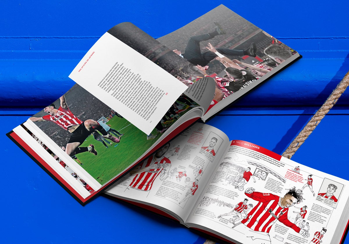 El libro, con un precio de 18 euros, está dividido en cuatro secciones, cada una con un amplio texto que relata los hechos pero, más importante aún, evoca aquel tesoro de sensaciones. Una de ellas abarca los días en que Bilbao abrió sucursal en la capital andaluza y la envolvió en bandas rojas y blancas: «Se parecía un poco al juego ese en el que hay que encontrar a Wally, pero al revés. ¿Hay algún sitio donde no esté Wally?», relata en esa sección el periodista Luis López, que destaca el ambiente «de sana camaradería, de tribu, de grupo unido por un vínculo que mezcla historia, mitología y filosofía». Otro apartado se centra en la final, y aquí es Jon Agiriano quien desmenuza el complejo estado anímico al que dio lugar la victoria, algo así como una exaltación conmovida: «Miles de aficionados lloraron, muchos de ellos con el recuerdo, tan vivo en ese preciso instante, de los seres queridos con los que no podían compartir un triunfo que habían esperado juntos tantos años, padres, madres, abuelos, hermanos, tíos y amigos con los que habían superado tristezas y desengaños sin perder nunca la esperanza», escribe Agiriano. Un tercer bloque sufre y goza la final desde Bilbao, incluido un San Mamés atestado donde se hizo tanto «teletrabajo», tal como lo formulan Miguel Pérez y Xabier Garmendia.