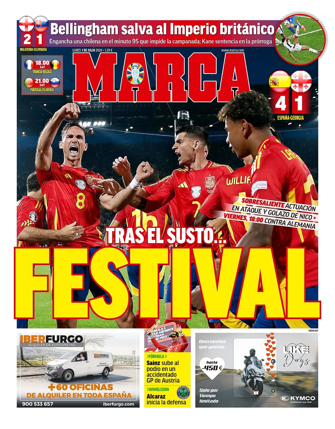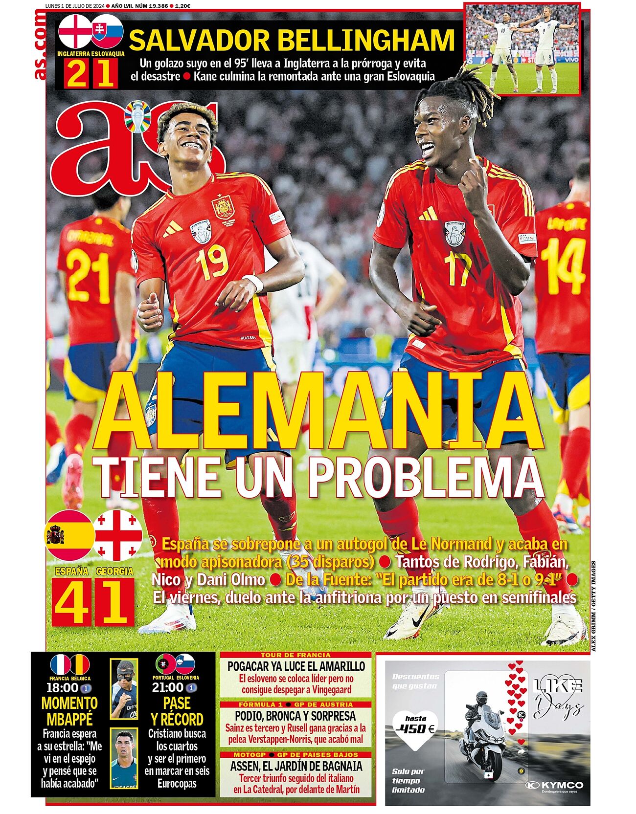 La imagen de Nico Williams y Lamine Yamal bailando sobre el césped del estadio Rhein Energie de Colonia acapara las portadas de los principales medios deportivos españoles. Todos coinciden en sus análisis: esta selección juega al ritmo del pequeño de los Williams y del joven Lamine Yamal. Y, además, hace disfrutar al espectador.