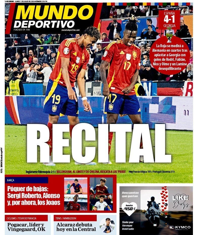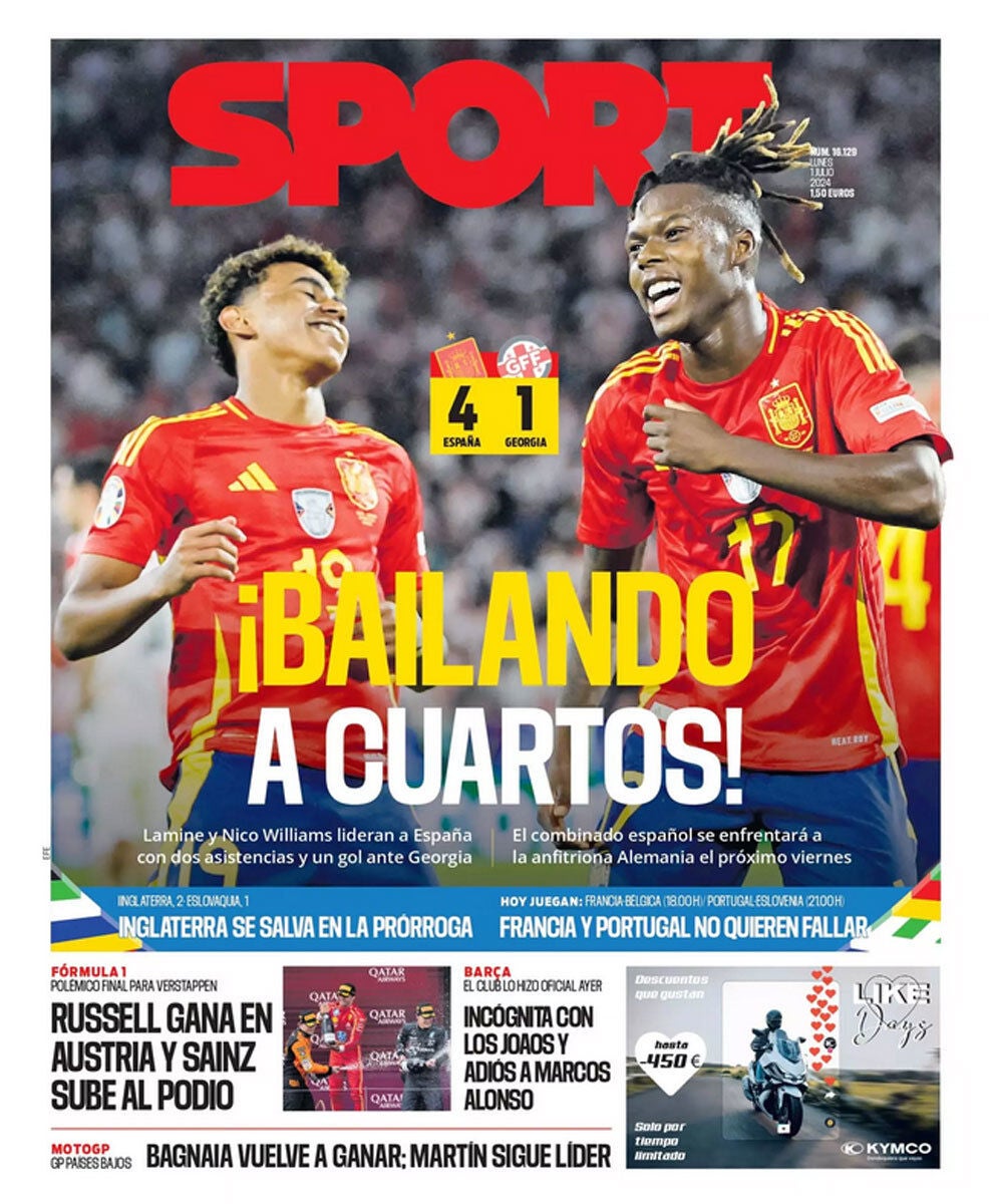 Y en Cataluña se frotan las manos porque sueñan con juntar a Nico y Lamine en el Barça. Tanto Mundo Deportivo como Sport llevan en su foto de portada a la pareja de la selección bailando sobre el estadio de Colonia y en la contracrónica de Mundo Deportivo se compara a Nico con Luka Doncic: «No sólo sabe donde colocar el balón, sabe donde será más peligroso». En Sport aseguran que Yamal «pide a gritos» el fichaje de Nico y que «la química que se genera entre ambos se transmite a todo el equipo, que avanza contundente por el campeonato y sin perder nunca la sonrisa».