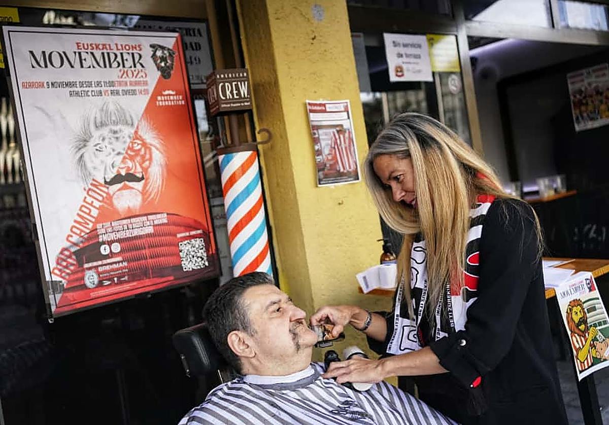 Como cada noviembre desde 2017, la Peña Euskal Lions ha transformado el bar Campeón, situado justo frente a San Mamés, en una pequeña barbería improvisada ... con un objetivo solidario.