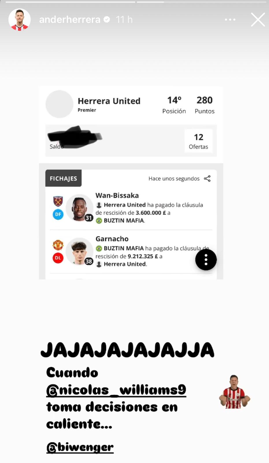 Al parecer, y según han compartido Herrera y Nico en sus redes sociales, el origen del pique está en el llamado 'clausulazo'. El '10' rojblanco, que se hace llamar 'Buztin mafia', le pagó a tocateja 9,2 millones de libras a Herrera por 'robarle' a Garnacho, la joven perla del Manchester United. Y el centrocampista le respondió con otro 'clausulazo' de 3,6 millones por Wan-Bissaka, del West Ham.
