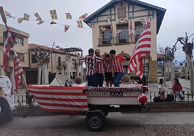 Y lo han hecho de la forma más original. Por delante, una furgoneta municipal con una bandera del Athletic. Por detrás, una lancha, denominada 'Itxasoko Ama', también decorada con motivos rojiblancos.