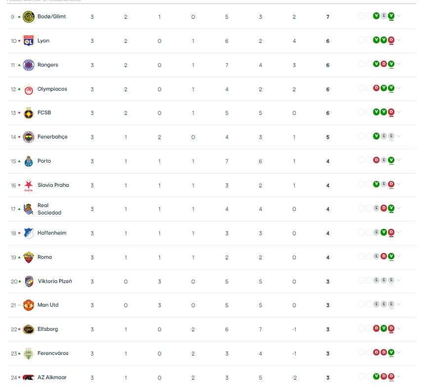 Los equipos que finalicen la fase liga desde el puesto 25 en adelante, quedarán eliminados. Por ahora, son el Malmo, el Sporting de Braga, Besiktas, Twente, Union SG, PAOK, RFS, Niza, Ludogorets, Maccabi de Tel Aviv, Dynamo de Kiev y Qarabag.