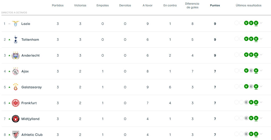 No se enfrentarán todos entre sí. Sería un calendario inviable. Por lo tanto, cada equipo se verá las caras a ocho equipos diferentes (cuatro en casa y cuatro fuera). ¿Y qué pasa cuando terminen todas las jornadas? Los ocho primeros de la general pasan directamente a octavos de final. Precisamente, el Athletic ocupa esa octava plaza. Le acompañan, por orden de clasificación, Lazio, Tottenham, Anderletch, Ajax, Galatasaray, Frankfurt y Midtjylland.