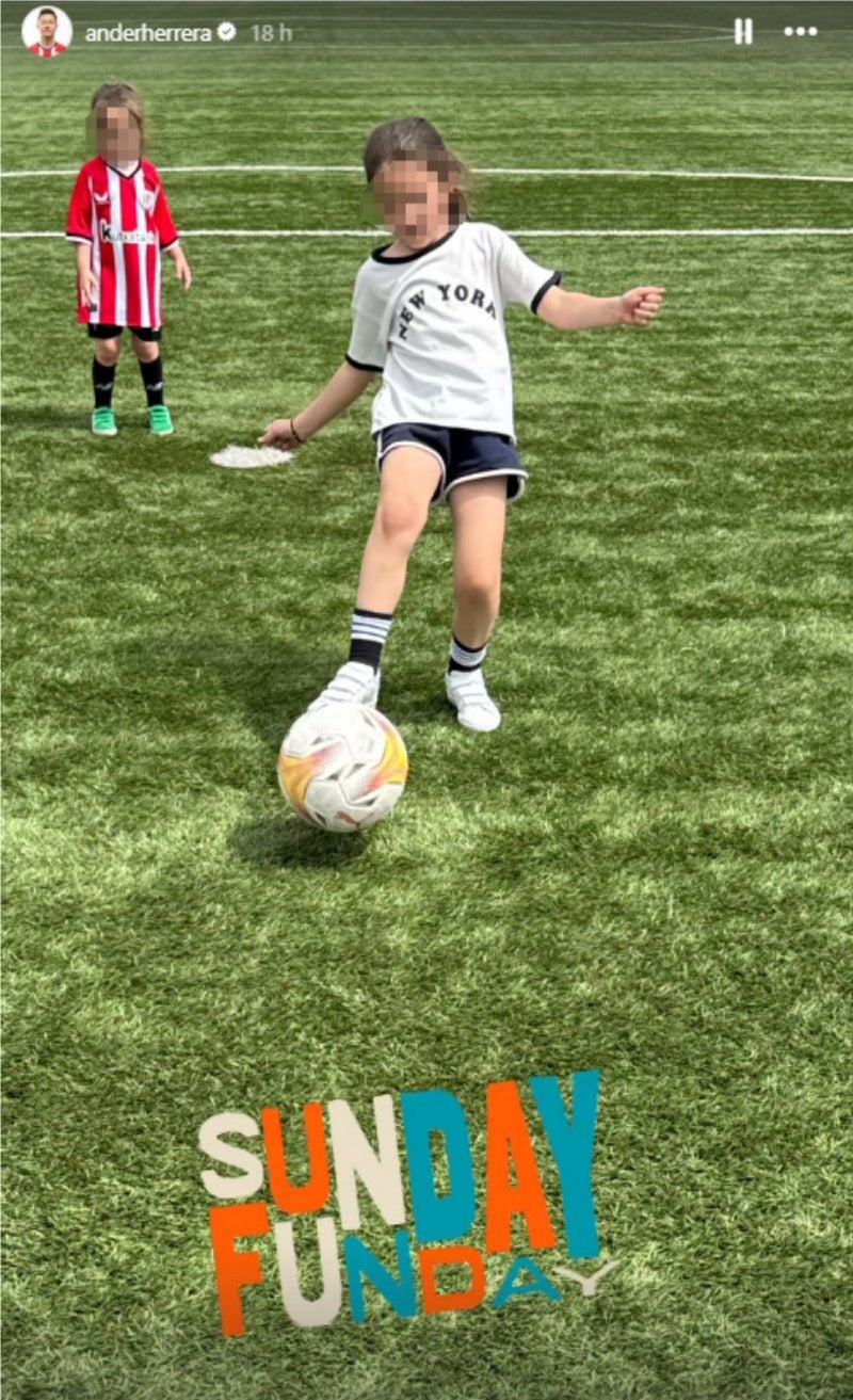 Ander Herrera ha colgado en su perfil de Instagram un simpático vídeo de sus hijas jugando al fútbol. Son dos stories -un vídeo y una foto- en las que se puede ver a las crías vestidas de corto sobre el césped de un campo de fútbol. La protagonista del vídeo es la más pequeña de la familia, que vestida de rojiblanco, se dispone a lanzar el balón. Coge carrerilla, suelta la pierna y ¡zas! se cae de culo.
