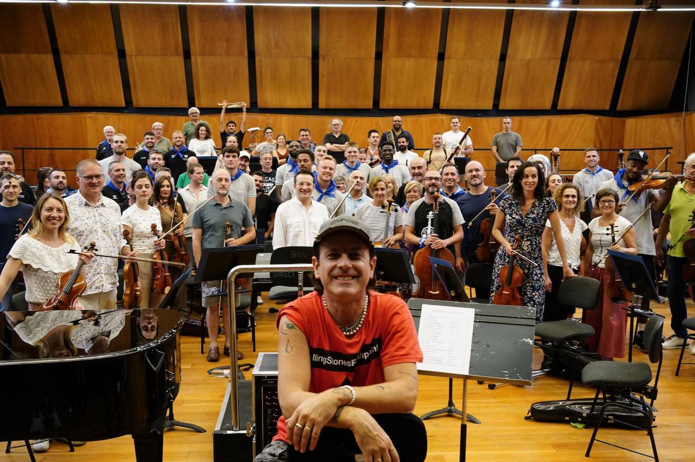 Todos accedieron a una gran sala donde sonaba algún trombón y bramaba una batería. Eran la banda del cantante Coti y los primeros miembros de la Bilbao Orkestra Sinfonikoa (BOS) que habían tomado posiciones. Los deportistas asistían al ensayo del concierto que tendrá lugar en el Euskalduna este miércoles. Rodearon la zona musical con rostros de sorpresa. No sabían que estaba ocurriendo. Tras una breve presentación, abrió la prueba Coti con los suyos y luego entró la BOS. Fue un instante maravilloso, un sonido impactante. Ovación del Surne. En broma, el vocalista pidió a los jugadores que «no aplaudan, es sólo como cuando ustedes hacen estiramientos».