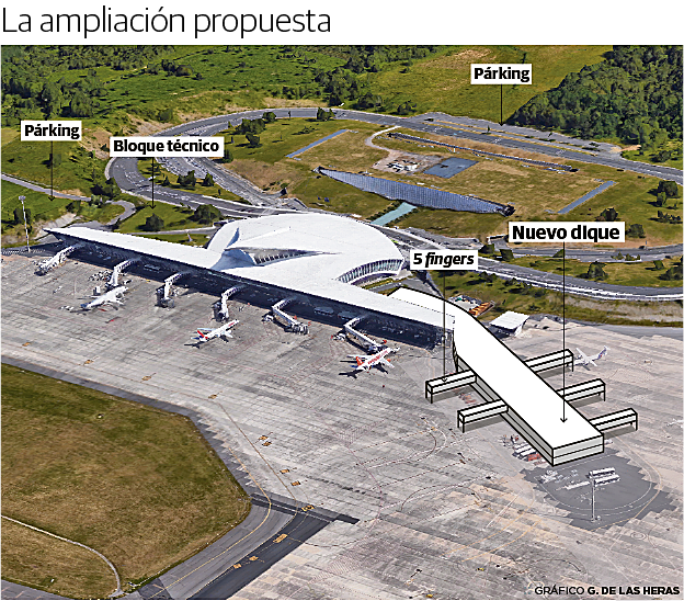 El proyecto pasa por extender el ala situado a la izquierda del edificio (si uno mira al campo de vuelos) para ganar allí un precioso espacio en el que habilitar cinco nuevos 'fingers' o pasarelas de contacto directas. La iniciativa prevé, además, ampliar la plataforma de estacionamiento de aviones, que se abrirá hacia la zona industrial, ganando más parcelas (hasta 30 aeronaves podrían parar allí).