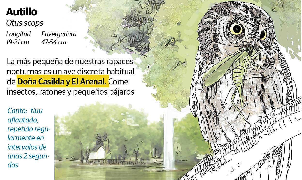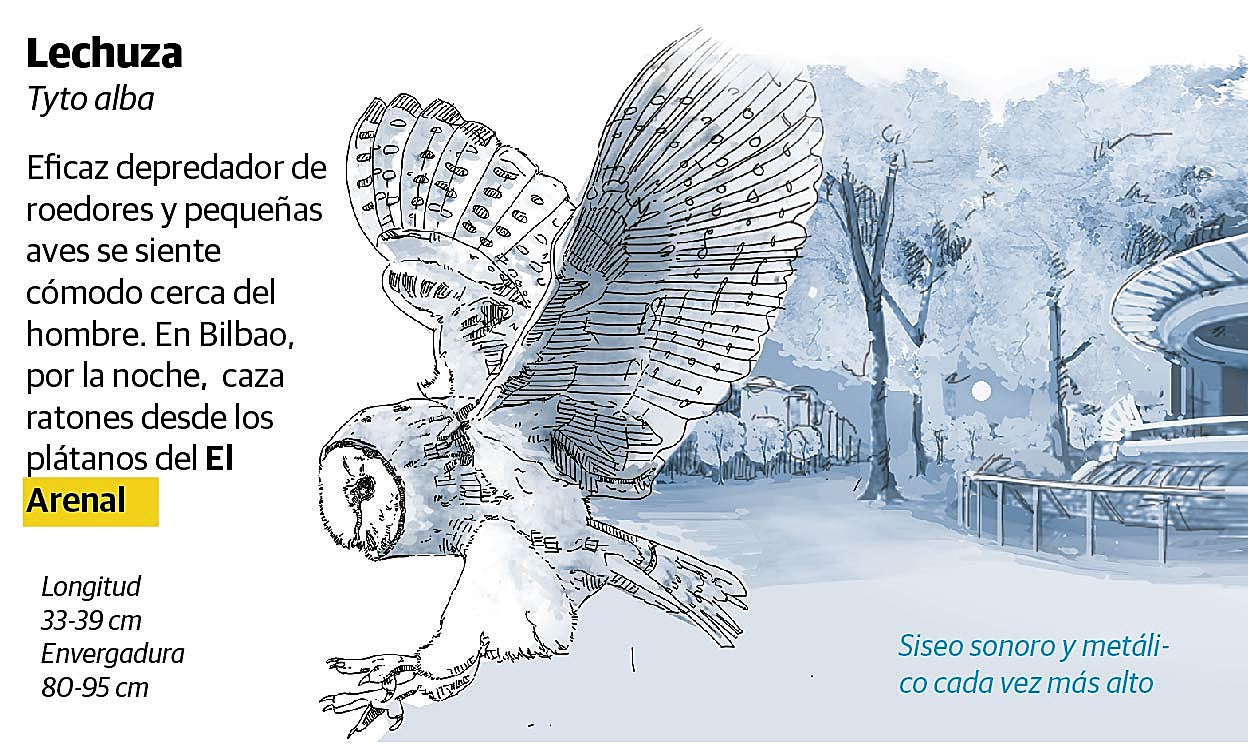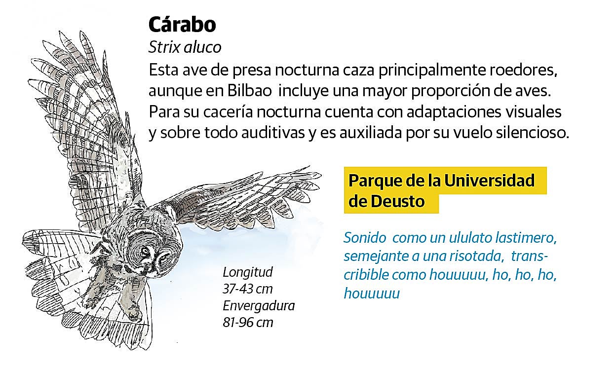 Si las lechuzas prefieren habitar buhardillas y edificios en ruinas de la ciudad y se alimentan de ratas y pichones en El Arenal, los cárabos, que pueden alcanzar casi un metro de envergadura, viven en zonas verdes de Doña Casilda y la Universidad de Deusto. Bilbao también cuenta con otra joya, el autillo común, que come insectos y reside en Doña Casilda y El Arenal. Todos son ejemplares que cuentan con una especial protección legal.