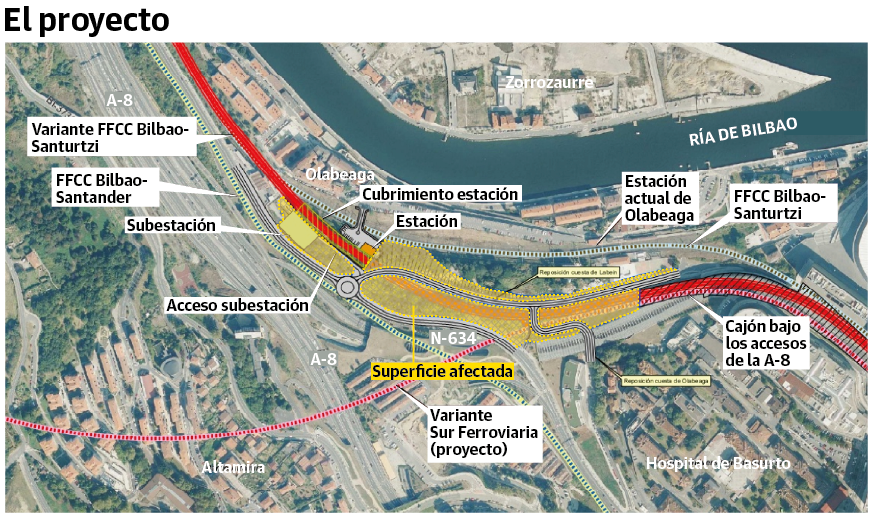 A grandes rasgos, lo que va a ocurrir en Olabeaga es que la línea férrea que une Bilbao y Santurtzi se va a desplazar hacia el sur, hacia la ladera, para discurrir bajo la carretera que va al barrio de Zorroza. Se cubrirá y será como un túnel. Eso liberará todos los suelos que ahora ocupa la trinchera ferroviaria, que será objeto de la nueva ordenación urbanística. De ese modo, desaparecerá la barrera que ahora parte el barrio y quedarán libres unos suelos en los que la previsión es construir unos 580 pisos (de los que el 50% tendrán algún tipo de protección pública). También habrá dos nuevas plazas con vistas a la ría y un parque lineal en el borde de la ladera.