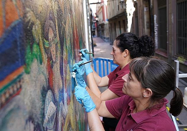 Vecinos del Casco Viejo y visitantes curiosos se detienen estos días frente al cantón Julián Etxebarria 'Camarón', junto a la calle Carnicería Vieja. Allí trabajan ... Josune Ostio, Nagore Zalbidea y Marina Aguiar, las restauradoras encargadas de recuperar el mural que Juan Zarate Ibargoitia pintó en 1994 en una de sus paredes. La obra, ya convertida en un emblema de las Siete Calles, apareció vandalizada a finales de junio con varios grafitis en su parte inferior. Unas pintadas «difíciles de eliminar» que ponían en riesgo su conservación. Tras meses marcados por la incertidumbre y el pesimismo entre los vecinos –temían que la pintura acabara desapareciendo– la semana pasada comenzaron los trabajos de restauración.