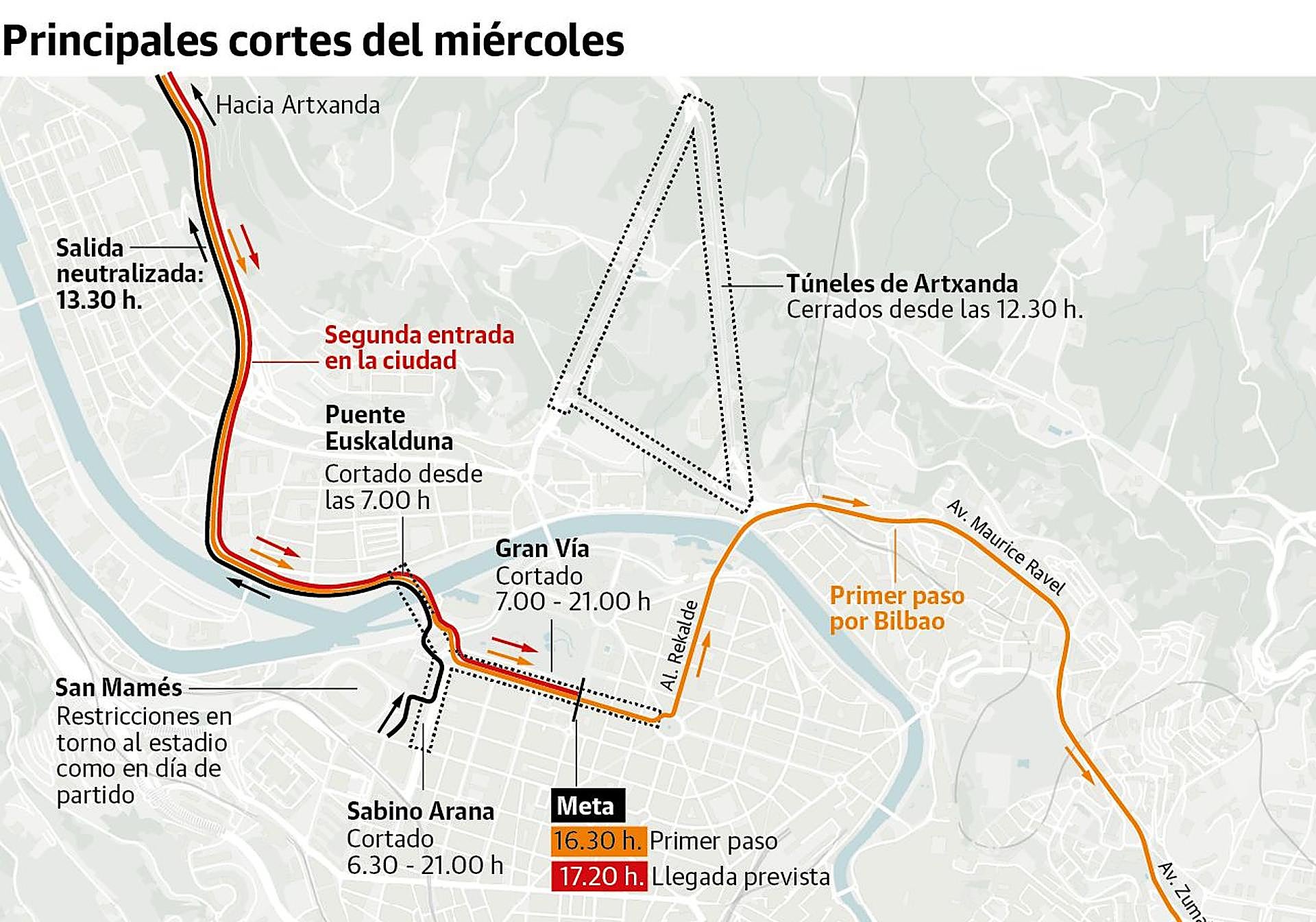 La prueba ciclista más importante de España recala de nuevo en Bizkaia para recorrer gran parte del territorio. El pelotón partirá de la calle Luis Briñas a las 13.30 horas y la meta estará situada en la Gran Vía a la altura de la calle Gregorio de la Revilla, donde la etapa finalizará sobre las 17.30 horas. Entre medias los ciclistas deberán cubrir un circuito de 157, 4 kilómetros que será similar al que se diseñó para 2023 cuando el Tour recaló en la villa.