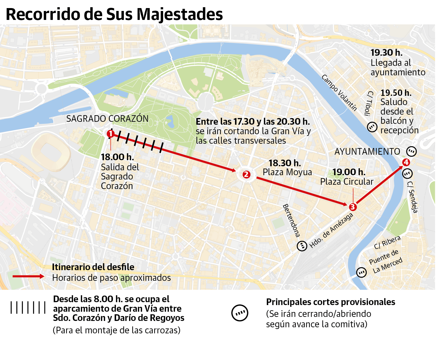 Previamente entre las 08:00 y las 18:00 horas, aproximadamente, se ocupará el aparcamiento en la Gran Vía, entre la plaza Sagrado Corazón y la calle Darío de Regoyos para llevar a cabo los trabajos de montaje y desmontaje de las carrozas. Se permitirá el acceso y salida a los garajes.