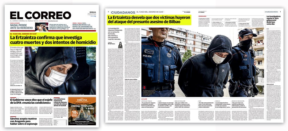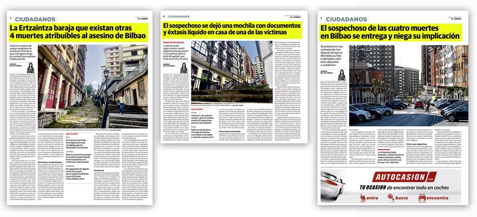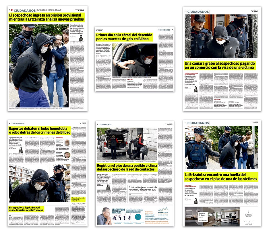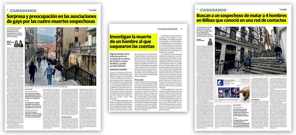 Por tercer día consecutivo, el caso del asesino de gais copa las primeras páginas de EL CORREO. El 'modus operandi' del presunto autor de las muertes atemoriza a la comunidad gay en Bilbao y la Ertzaintza comienza a trabajar en la idea de que éste hubiera actuado también en alguna otra comunidad.