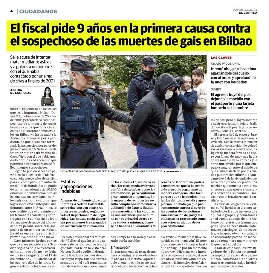 El homicidio de un vecino de Bilbao de 43 años el 18 de octubre de 2021, al que después de fallecido saquearon sus cuentas bancarias, fue sólo la punta del iceberg de una serie de crímenes que conmocionaron a todo el país y que fueron destapados por este periódico. El 28 de abril de 2022, hace justo un año, EL CORREO publicaba en exclusiva que la Ertzaintza se encontraba inmersa en una compleja investigación para determinar las causas de la muerte de este hombre, que había sido localizado sin vida en su domicilio en el Casco Viejo y que permitió sacar a la luz otras fallecimientos sospechosos de gais a los que conocía en chats de citas.