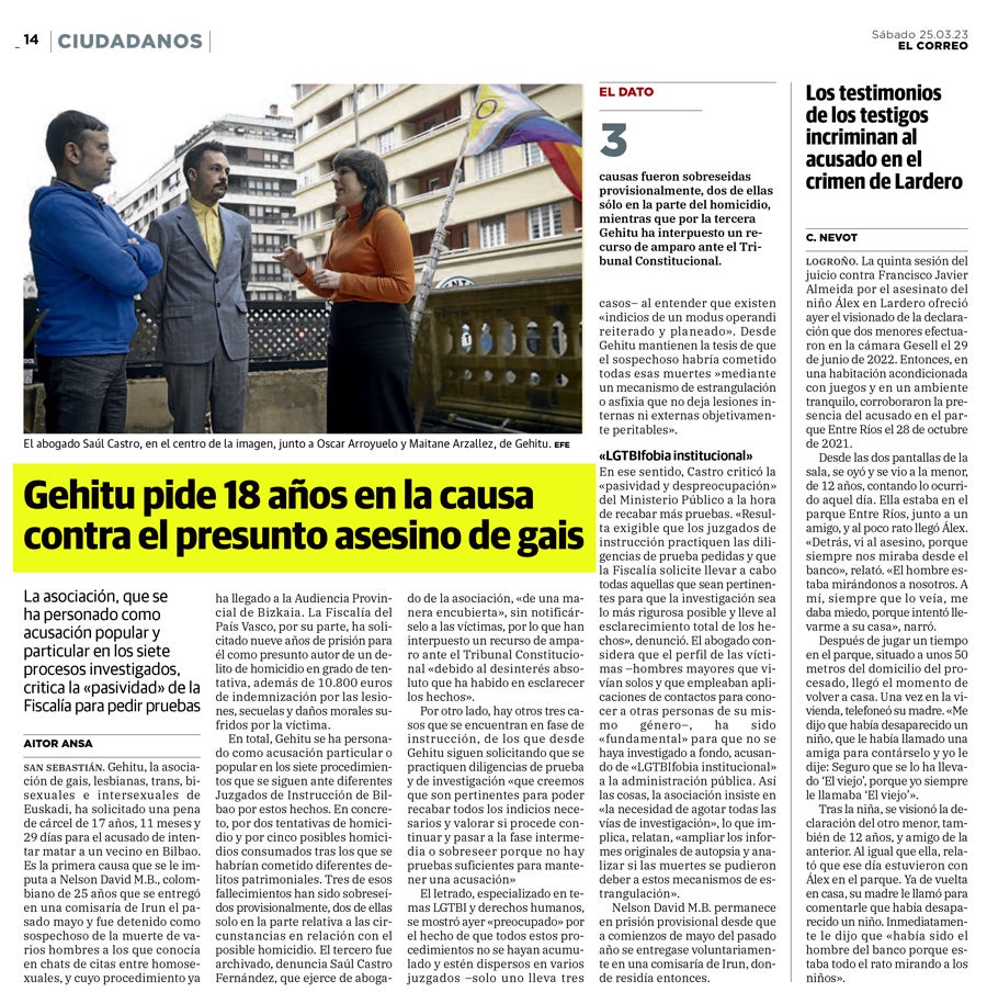 Gehitu, la asociación de gais, lesbianas, trans, bisexuales e intersexuales de Euskadi, solicita una pena de cárcel de 17 años, 11 meses y 29 días para el acusado. os juzgados de Bilbao investigan siete casos del sospechoso de muertes de gais.