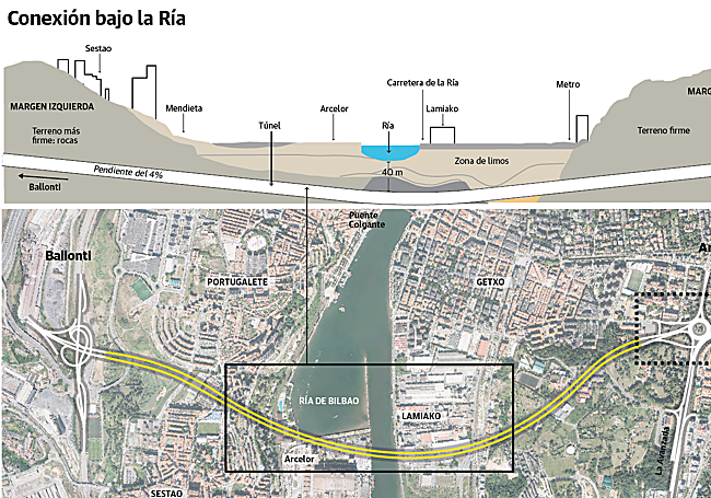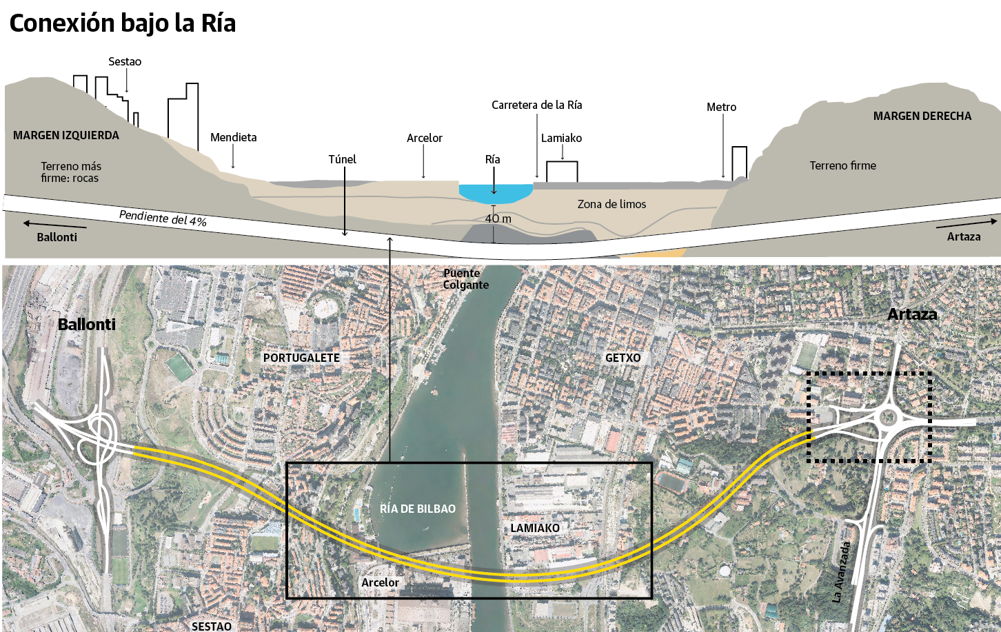 El proyecto de ejecución del enlace de Artaza también aporta cierta información general de la obra del subfluvial. Explica, por ejemplo, que el túnel bitubo –uno por cada sentido de circulación– que se ejecutará bajo la ría alcanzará los 45 metros de profundidad para evitar el suelo aluvial que caracteriza la vega de Lamiako. Se trata de un terreno arenoso compuesto por sedimentos transportados por el agua que han acabado dando forma a la zona y en los que es imposible cimentar ninguna estructura por su inestabilidad. Es debajo donde debe buscarse roca sobre la que crear el túnel que unirá la margen derecha y la izquierda.También se sabe que los trabajadores que atacarán el lecho fluvial desde Leioa y Sestao lo harán utilizando el sistema NATM, acrónimo en inglés que significa 'Nuevo método modificado austriaco'.