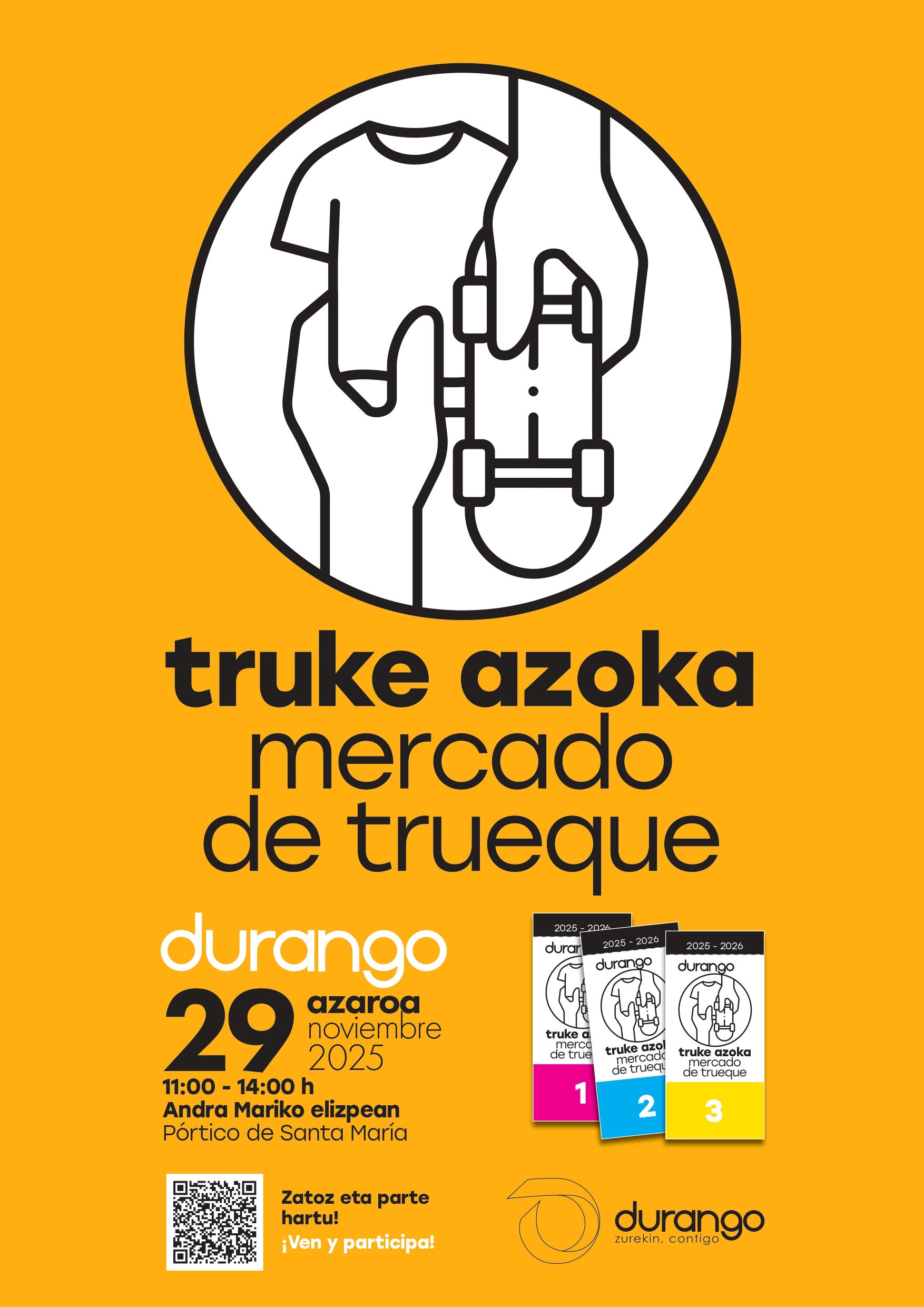 El Ayuntamiento de Durango organizará este sábado por primera vez el mercado del trueque, que se celebrará de 11.00 a 14.00 horas, en el pórtico de Santa María. Esta iniciativa busca promover la reutilización de objetos, apoyar la economía circular y reforzar la colaboración entre vecinos. Cualquier persona podrá participar trayendo cosas que ya no utilice y cambiándolos por otros disponibles. Se admitirán juguetes, libros, ropa y artículos variados de música, decoración y aparatos tecnológicos, siempre que estén completos, limpios y en buen estado. No se aceptarán electrodomésticos o móviles.