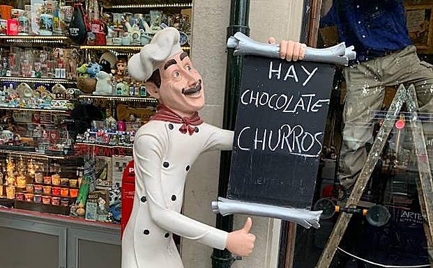 Es el 'camarero' que más turistas contabiliza en Bilbao. Lleva años en el paseo del Arenal, puerta de paso para miles de viajeros que acceden a diario al Casco Viejo. Nunca se le borra la sonrisa de la cara y no se puede decir que esté de brazos cruzados. Lleva tiempo anunciando chocolate con churros en una compleja postura, sin que aún se queje de dolores de espalda. Con un bigote tan típicamente parisino y ese gorro, garantista de que en la cocina el cumplimiento de las normas higiénicas debe seguirse a rajatabla, este barman al que tampoco se le conoce nombre se ha convertido en el mejor compañero de Angelines.