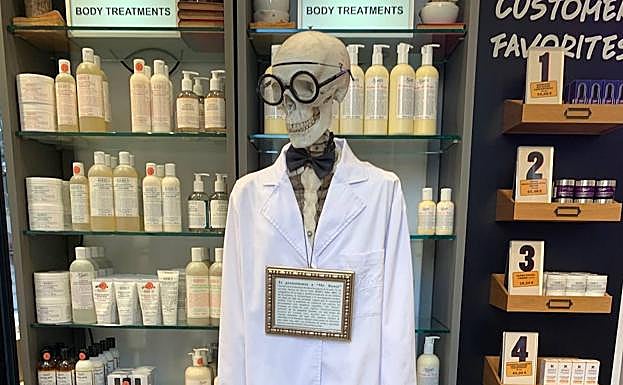 Su becario compite en prestancia con 'Mr. Bones', el elegante esqueleto que custodia la entrada de la perfumería y cosmética neoyorquina Kiehl's, fundada en 1851. Se ha convertido en uno de los vecinos más ilustres de Indautxu. Es imposible que pase desapercibido con sus gafas tan 'chic', su estilosa pajarita y el marco, en tonos dorados, que lleva colgado para dar cuenta de quién es. No suelta ni palabra (lógico) pero lo dice todo en el cuadro que luce a modo de medallón. Confiesa que se trata de una réplica «anatómicamente correcta» de un esqueleto humano y advierte que no está hecho de huesos de verdad. Con su sinceridad, 'Mr. Bones' se ha ganado al vecindario. «Todo el mundo se para al verle y se hace fotos con él», explica Bego, una de las dependientas. «También los extranjeros. Muchos le abren la bata de par en par, cuando no le dan un beso o simplemente hablan y le sueltan un 'hola' desde la calle».