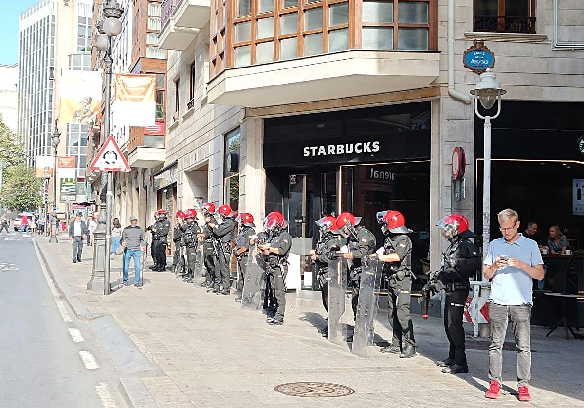 La Ertzaintza ha desplegado un amplio dispositivo alrededor del hotel de la cadena israelí NYX situado en El Arenal, por donde ha pasado la columna de manifestantes que ha salido del puente de San Antón y ha atravesado en Casco Viejo de Bilbao.